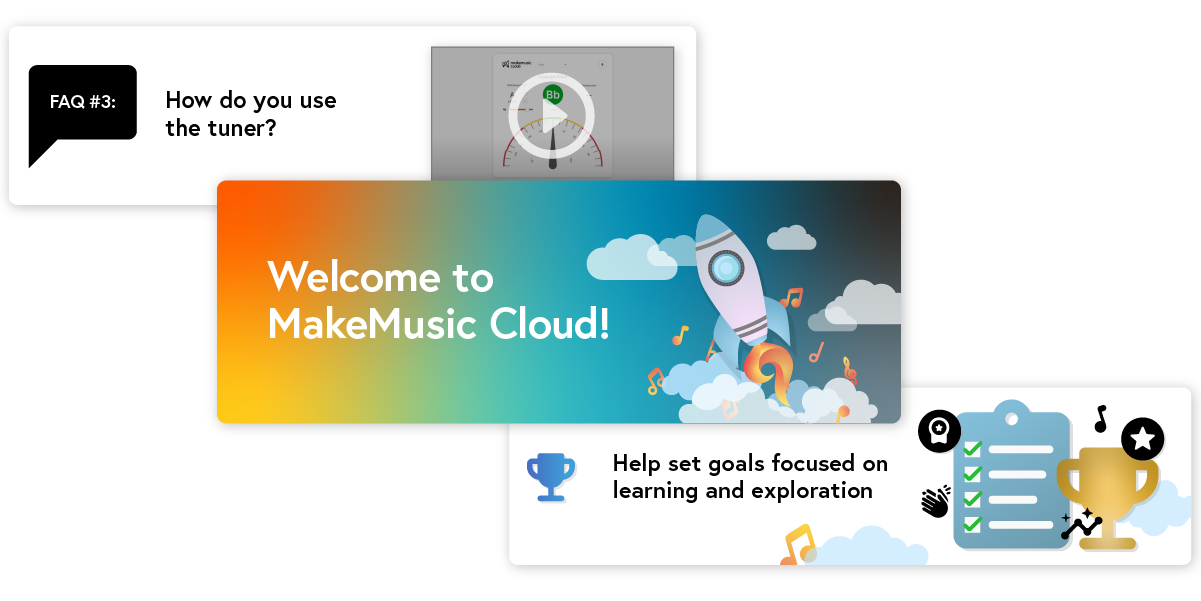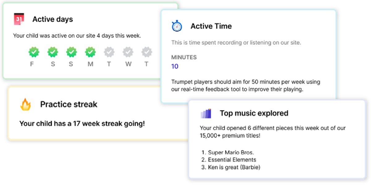 Supporting adults who enroll to receive their child’s Weekly Highlights Email will receive a few helpful messages about encouraging their child musically, tips on how to assist their child with MakeMusic Cloud, and will be reminded of how important their presence is in their child’s musical journey. Additionally, each week they will receive a personalized Highlights Email to give them insights into the music their child is playing, how much they are practicing, what assignments are upcoming, and more!