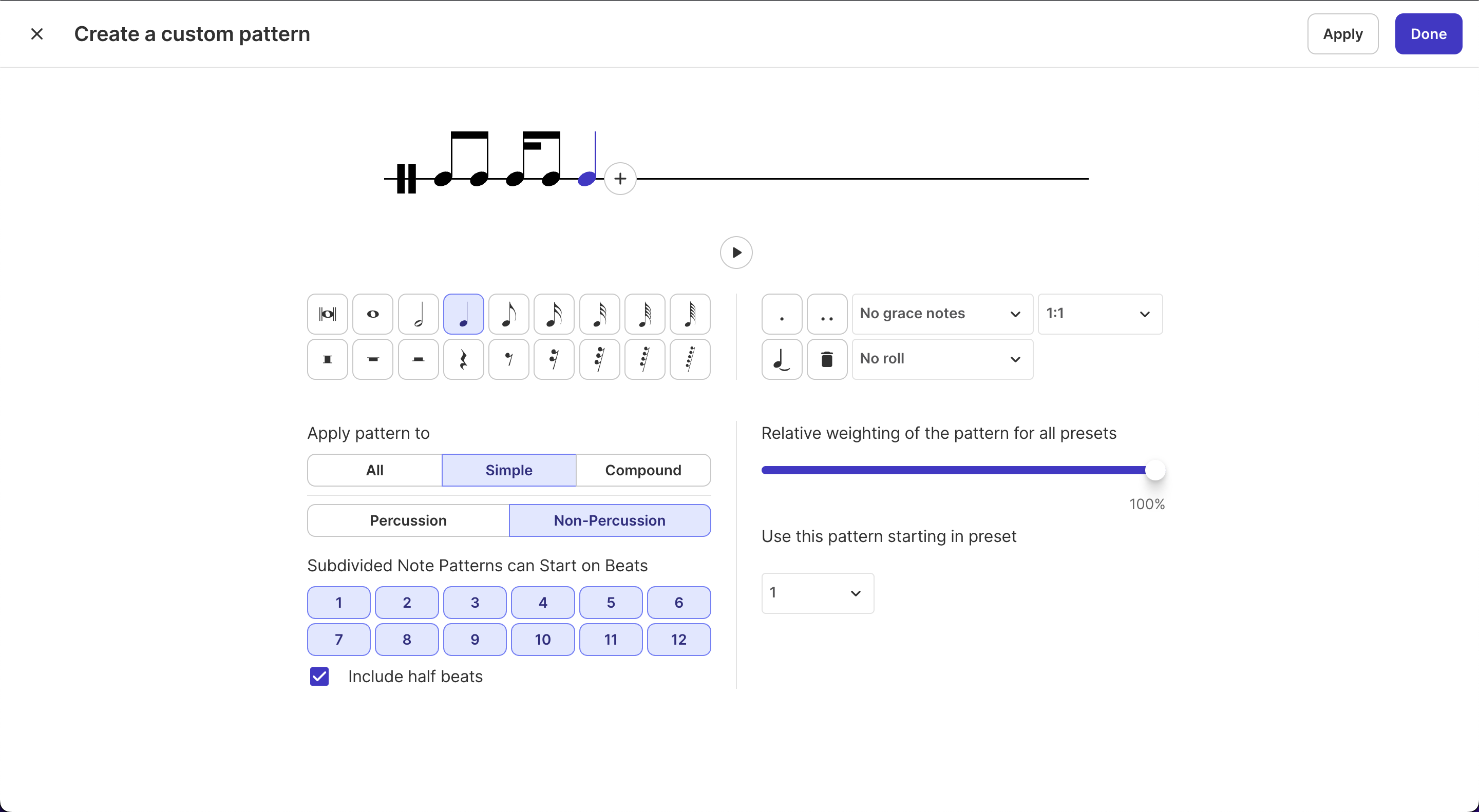 In the custom pattern editor, you can craft any rhythm you would like to include in your sight reading music, as long as it fits within a single measure. Simply add the number of notes, select the duration of each note, and choose which presets to apply the pattern to.