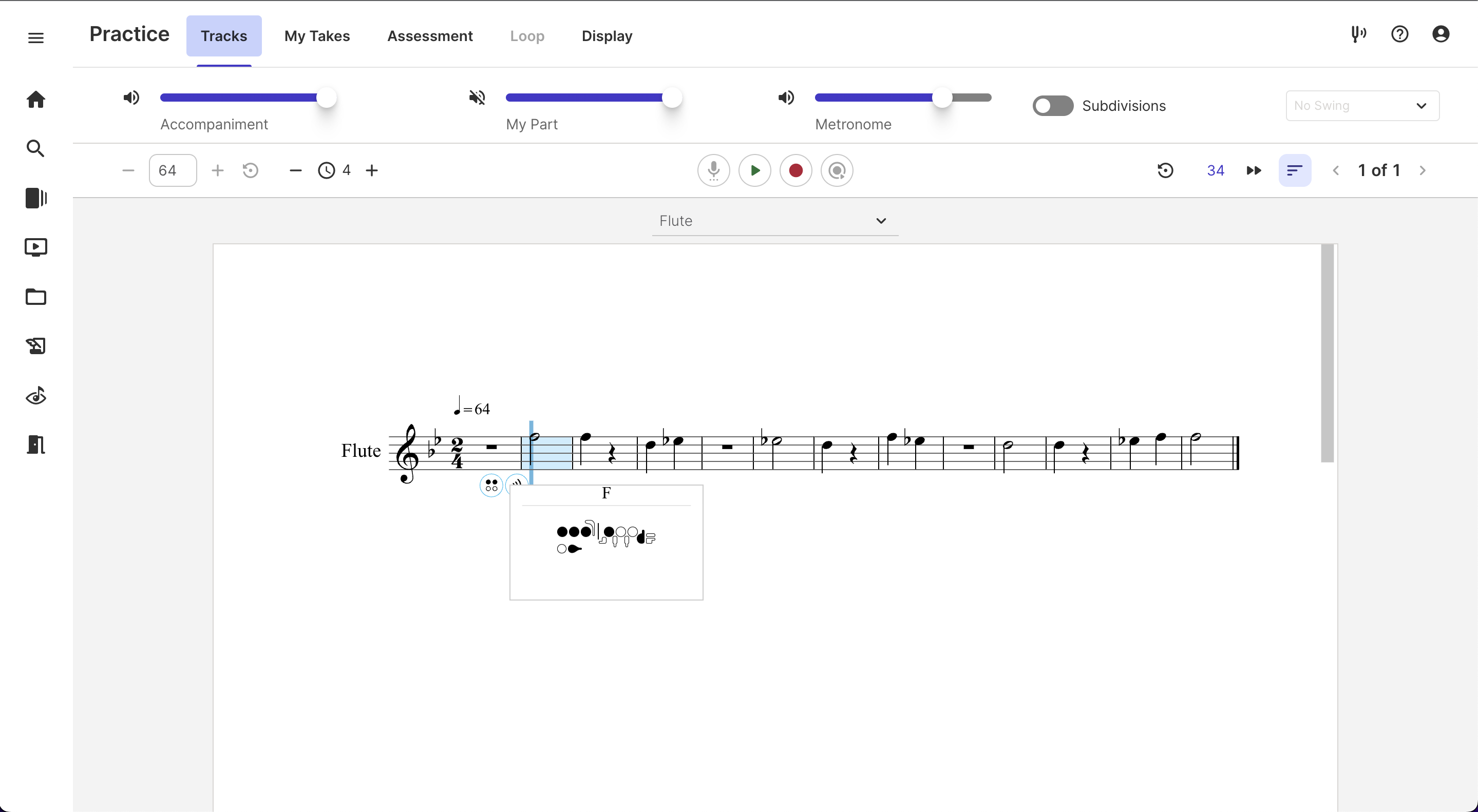 In addition to helpful practice features like a built-in tuner and metronome, there is also a lesser-known feature that can help improve your practice – fingering diagrams for each note. When you highlight a note in the Practice app, two buttons appear underneath: one to display the fingering(s) for a given instrument, and the other will play the selected note.
