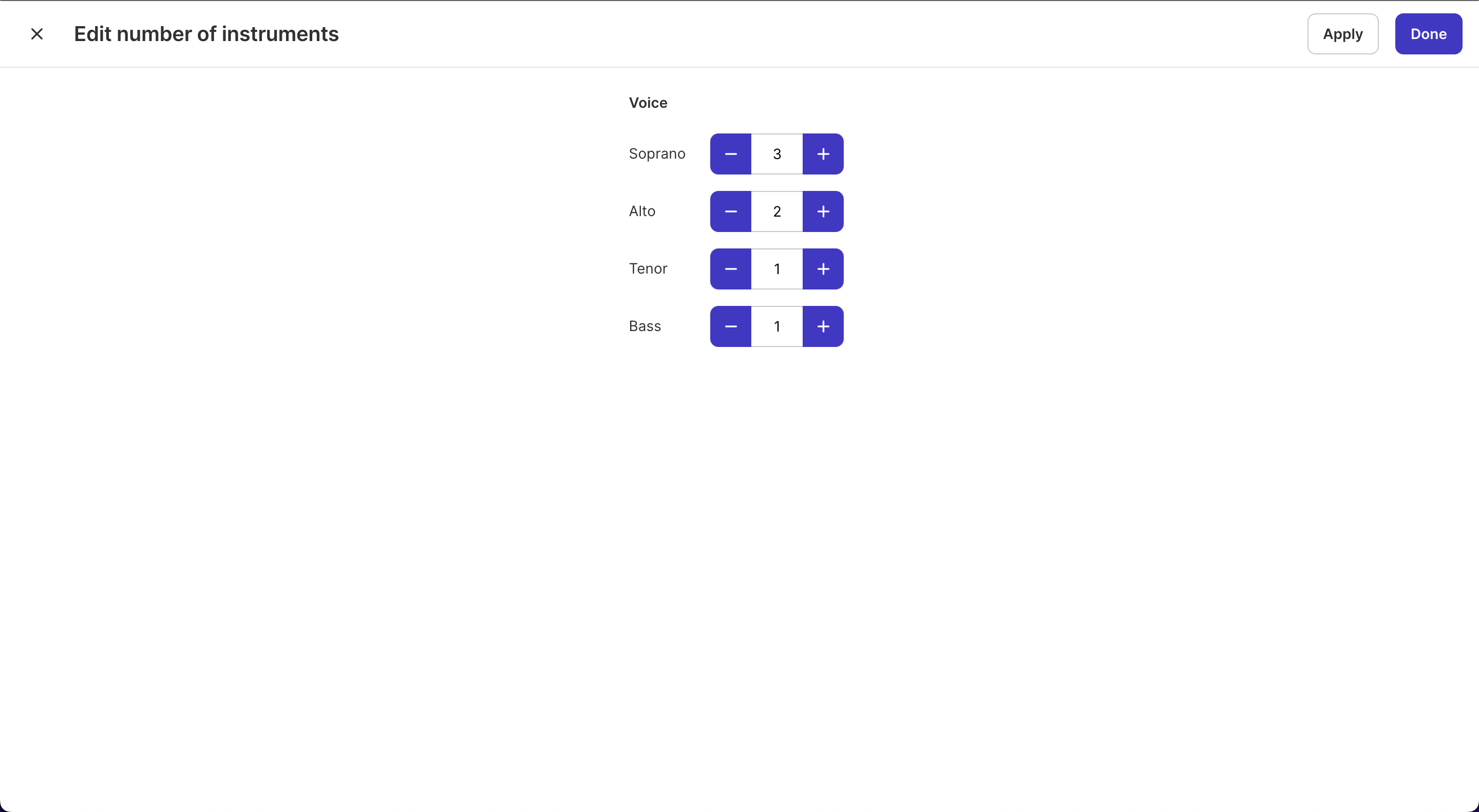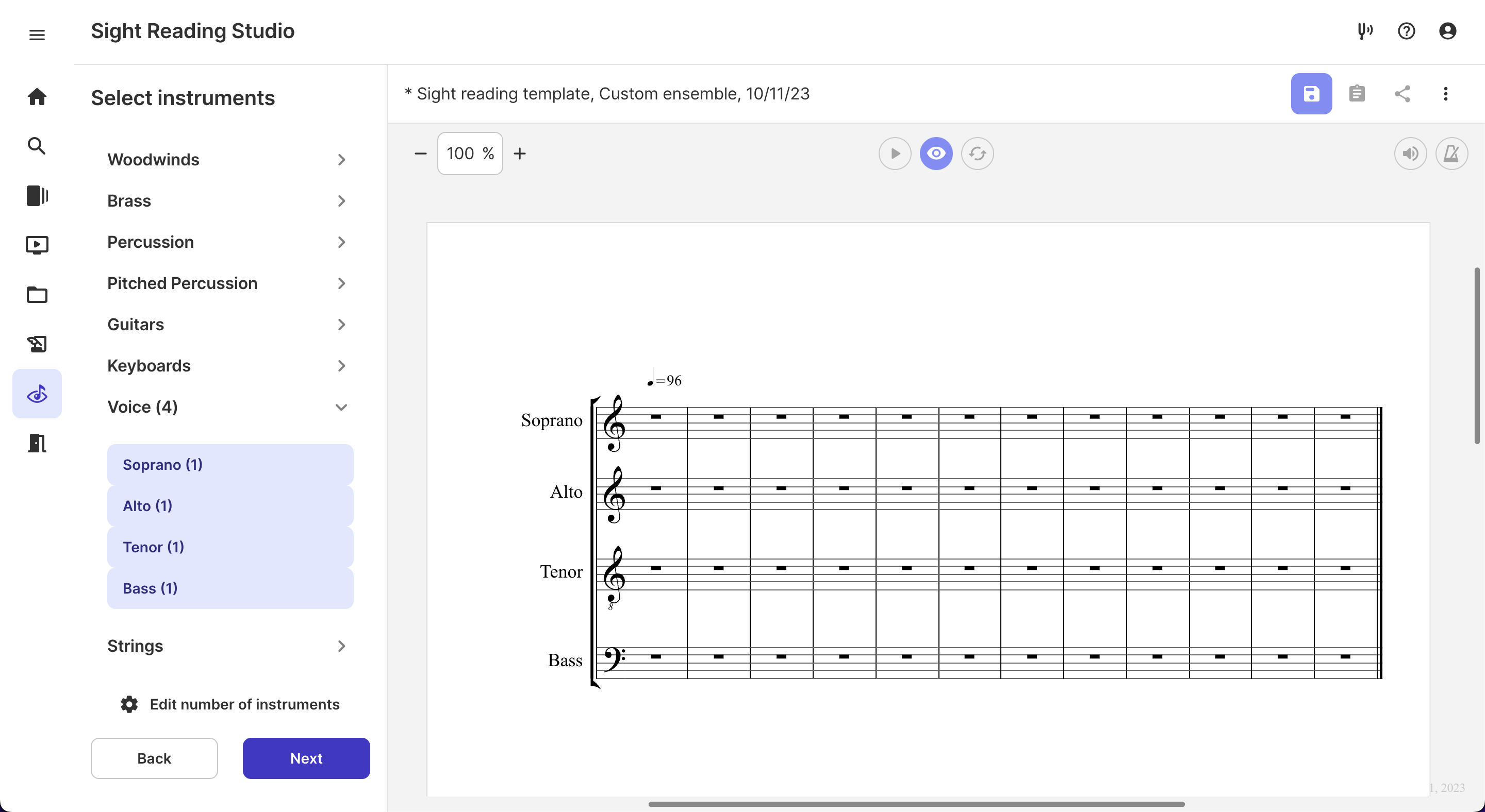 We’ve already covered how you can add multiple instruments to an exercise, but what about when you want multiple instances of one instrument? Not to worry. One of the newest features in Sight Reading Studio enables you to add as many instances of a given instrument as you wish. Simply select “Edit number of instruments” when starting your new sight reading template:
