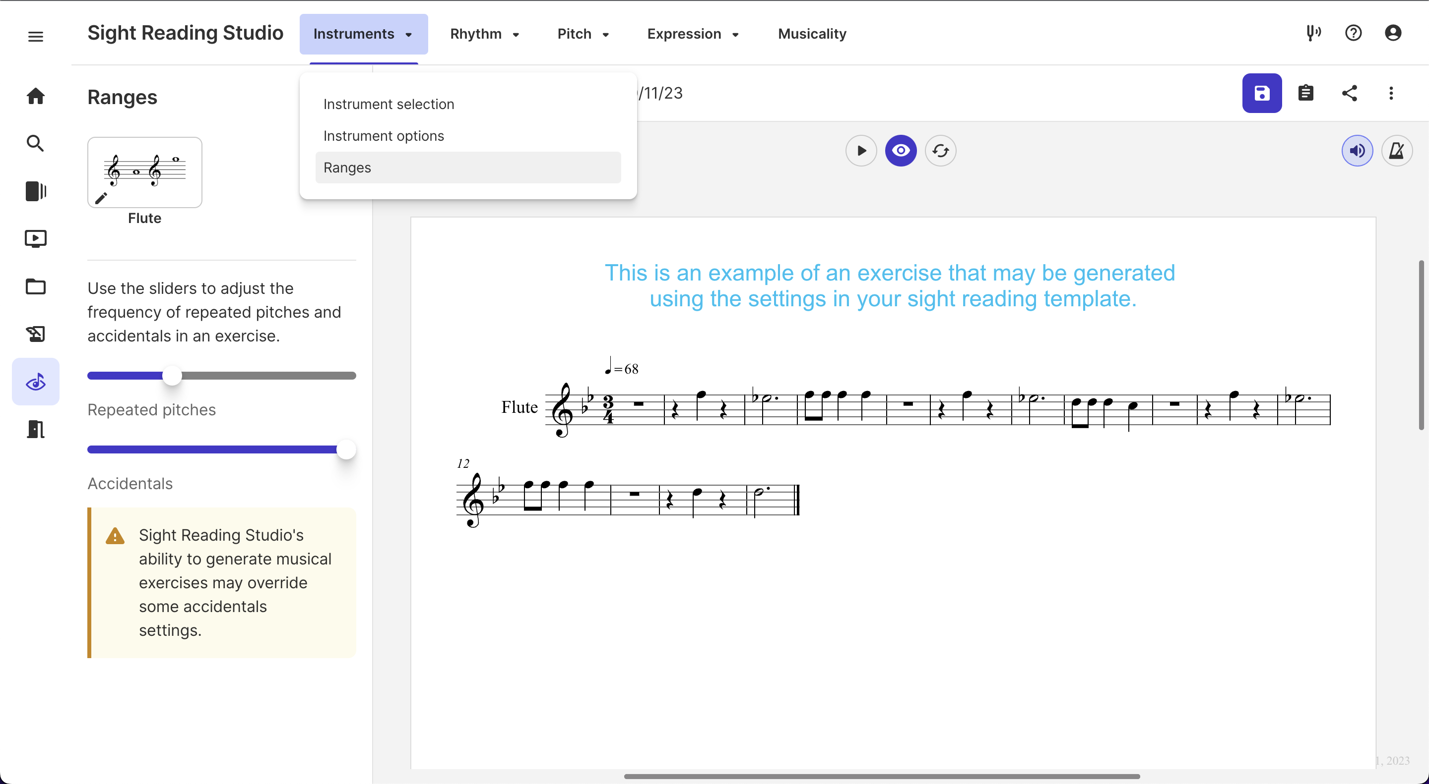 In the Ranges settings in the Instruments menu, you can modify the number of repeated pitches and accidentals in an exercise. Simply drag the sliders to change the settings to your desired output.