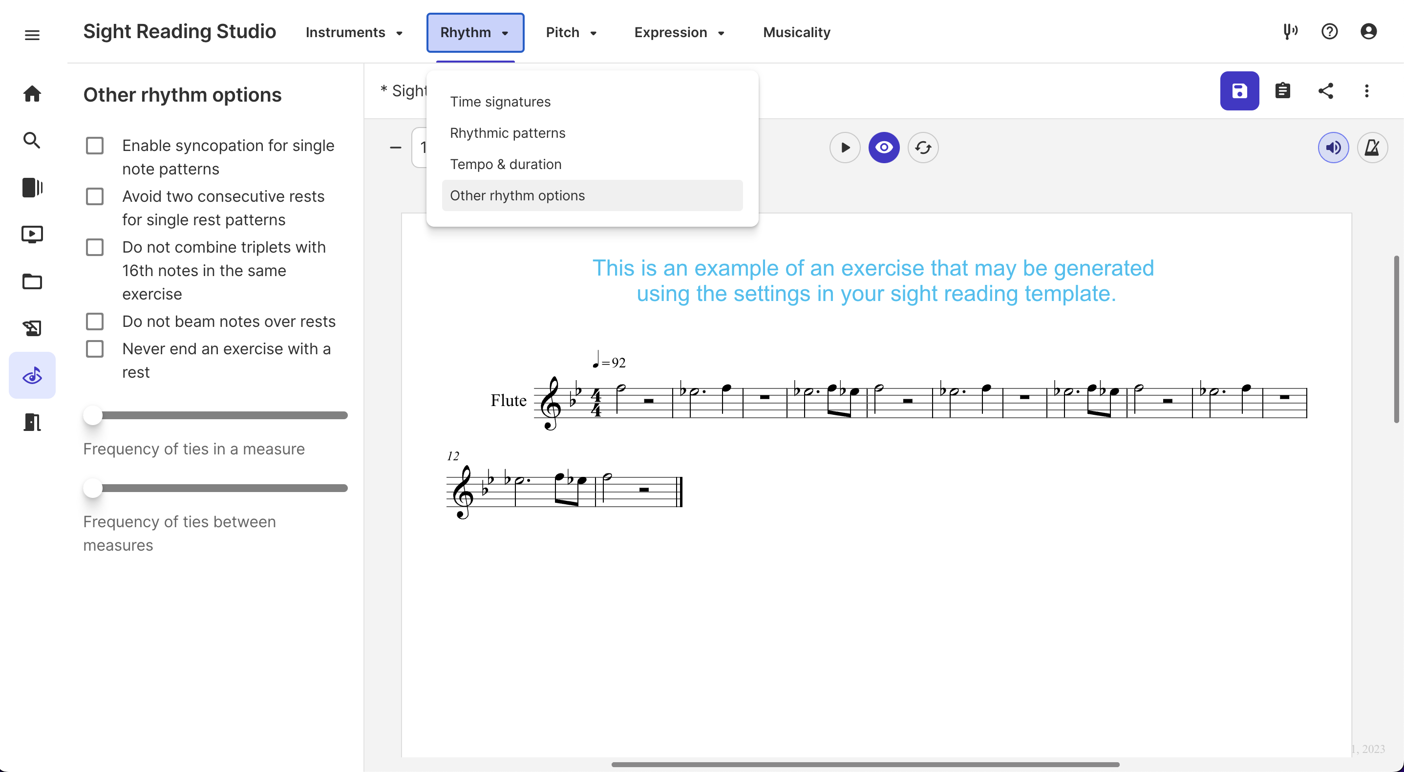 In addition to selecting your time signatures, rhythmic patterns, and tempo settings, Sight Reading Studio provides several additional rhythm options to fine-tune your exercises even further. You can enable syncopation for single note patterns, modify rest settings, set the frequency of ties in and between measures, and more.