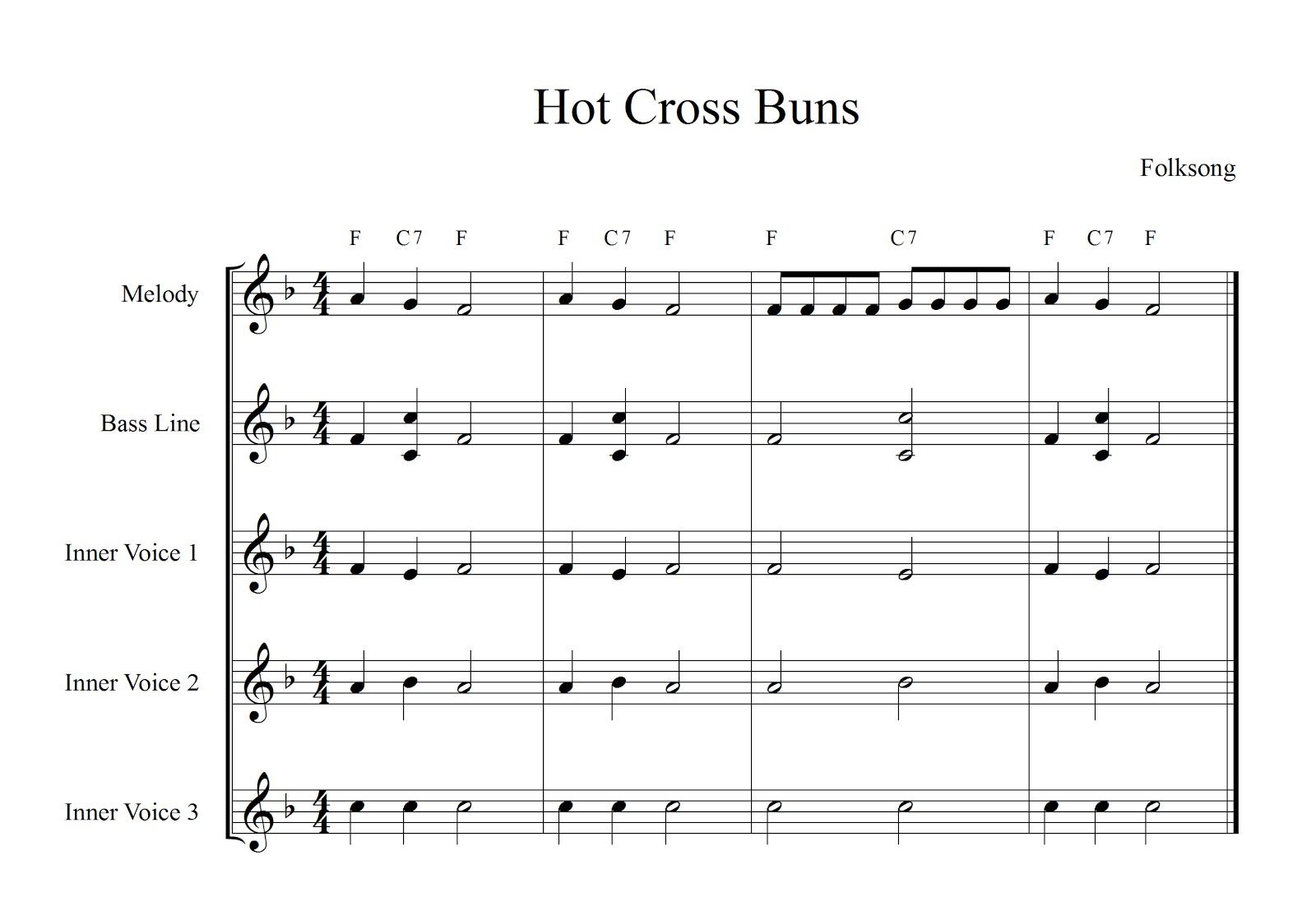 The next step is to play or sing a simple bass line while students are playing/singing the melody. This is a very important step in the process and should be repeated until everyone’s comfort level is high. When the group is ready to move on, you can start introducing students to the inner voices in the chord.