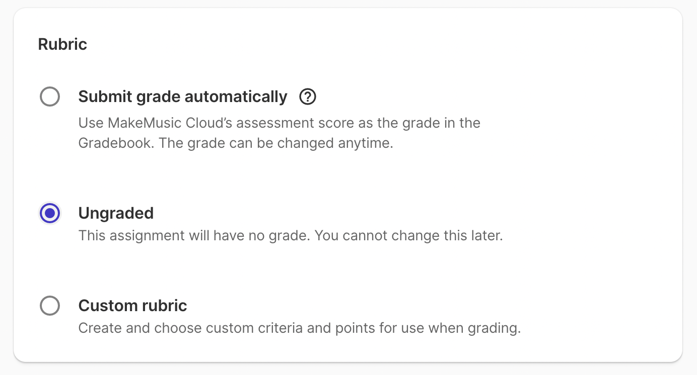 We heard you—there are times you want to assign a piece of music to your students, but don’t necessarily want to take a grade on it. This solution allows you to select whether you’d like to Use custom rubric or create an Ungraded assignment. Selecting Use custom rubric will take you through the flow that you have used before and will give you the opportunity to select and manage rubric items. Selecting Ungraded will bypass the rubric page completely as you continue on with the assignment creation process.